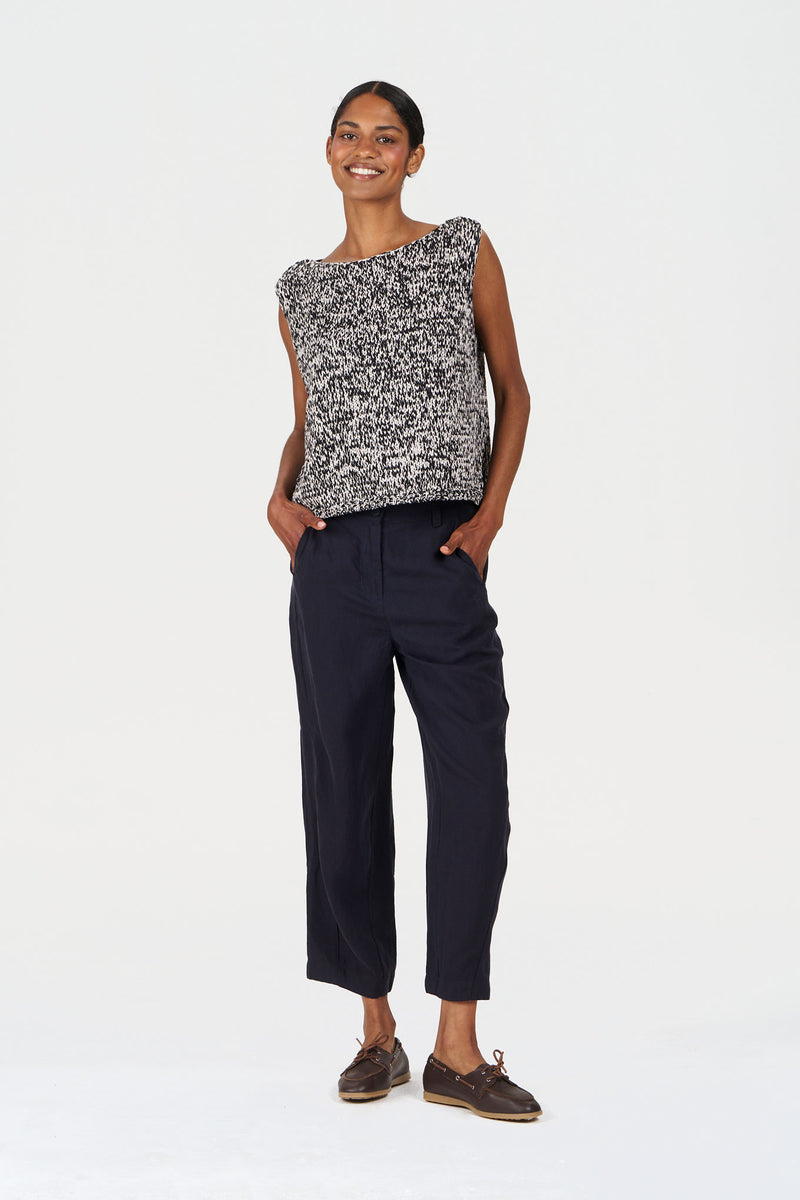 Crafted from a breathable blend of Tencel and linen, these navy trousers offer natural and effortless style. versatile wardrobe essential that transitions seamlessly through seasons. Also available in white.